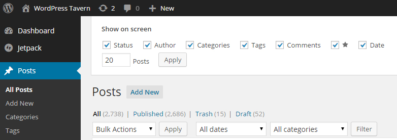 As of WordPress 4.0, the grid view of the media library has beautiful support for infinite scrolling, but list tables for posts and users still rely on old-fashioned pagination. Setting the screen options to include more listings can help, but this, too, can become cumbersome.