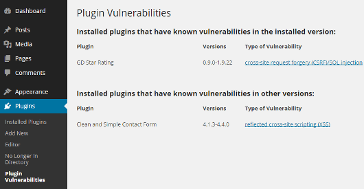 In the meantime, WordPress users need to remain vigilant about staying current with updates. Plugin Vulnerabilities is a plugin that helps users stay on top of security releases. Once installed on your site, it can automatically detect known security vulnerabilities in any of your installed plugins. It will alert you via the admin and you can also turn on email alerts for notification in your inbox.